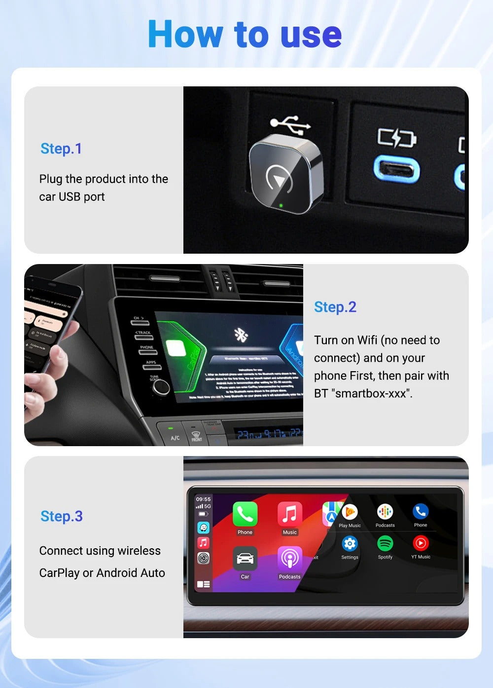 Please check your vehicle's CarPlay/Android Auto USB data port. Our product uses a USB-A port, which is the port found in most vehicles. If your vehicle has the newer USB-C (Type-C) port, you can choose to purchase an adapter separately.